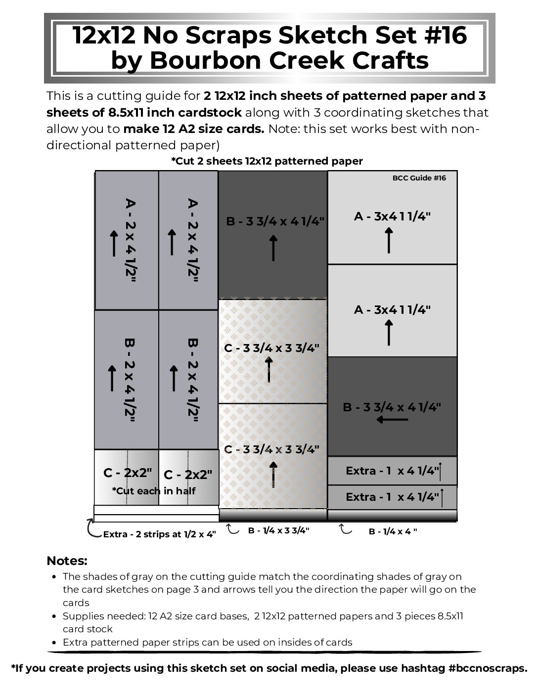 Cutting guide, instructions and card sketches to turn 4 sheets of patterned paper into 6  cards, leaving no scraps leftover.