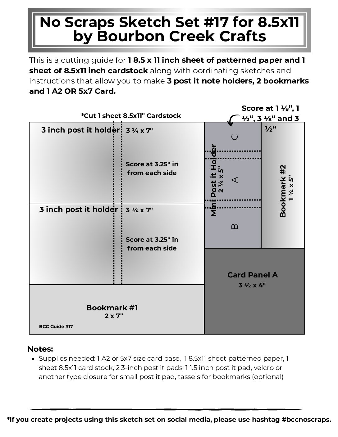 Cutting guide, instructions and card sketches to turn 2 sheets of patterned paper into 9 bookmarks and 6 cards, leaving no scraps leftover.